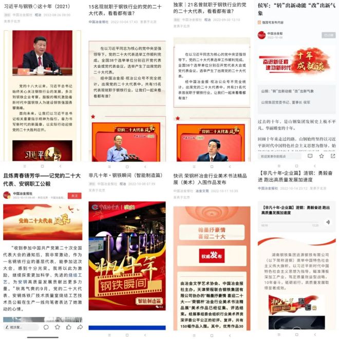 同時(shí),中國(guó)冶金報(bào)社旗下中國(guó)鋼鐵新聞網(wǎng),官方微信、微博、抖音號(hào),《中國(guó)冶金報(bào)》App,“今日鋼城” “冶金傳媒” “視·冶”“冶金文苑”“冶金安全環(huán)保”“冶金建設(shè)”,以及中國(guó)冶金報(bào)學(xué)習(xí)強(qiáng)國(guó)號(hào)、人民號(hào)、今日頭條號(hào)等全媒體矩陣平臺(tái),也圍繞黨的二十大的勝利召開(kāi),組織了一系列預(yù)熱性報(bào)道和活動(dòng)、特刊報(bào)道等。