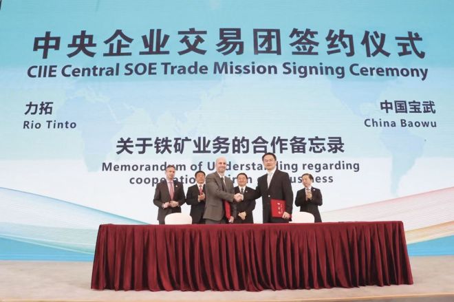 圖為在第二屆中國國際進口博覽會上,寶鋼股份和力拓集團的代表簽署關于鐵礦業務的合作備忘錄。(本報資料圖片)