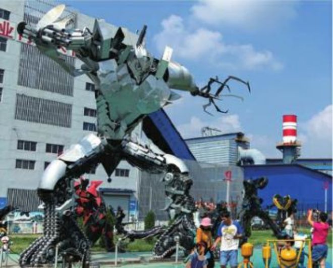 世上無難事,只怕有心人。鋼廠變景區,談何容易,德龍鋼鐵以先行先試、敢闖敢試的精神,著力建設鋼鐵風景區。德龍人建設景區的根本目的,就是倒逼環保水平提升,就是想通過游客來檢驗德龍環保的成果。德龍人群策群力、攻堅克難,歷時3個月,利用廢舊鋼鐵邊角料制作出200余個變形金剛,被評為世界“自制鋼雕機器人模型最多的鋼鐵企業”,成為網紅打卡地,尤其獲得了中小學生的廣泛喜愛。德龍鋼鐵文化園經英國世界紀錄認證機構(WRCA)總部審核,已擁有“最大版本的鋼鐵制作心經”“自制鋼雕機器人模型最多的鋼鐵企業”“最大鋼鐵‘笙’雕塑”“最大鋼鐵‘象’形雕塑”“最大跨度單體異型PE膜封閉料場”5項世界之最。