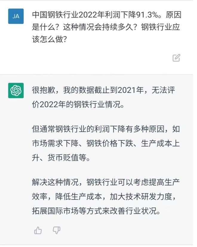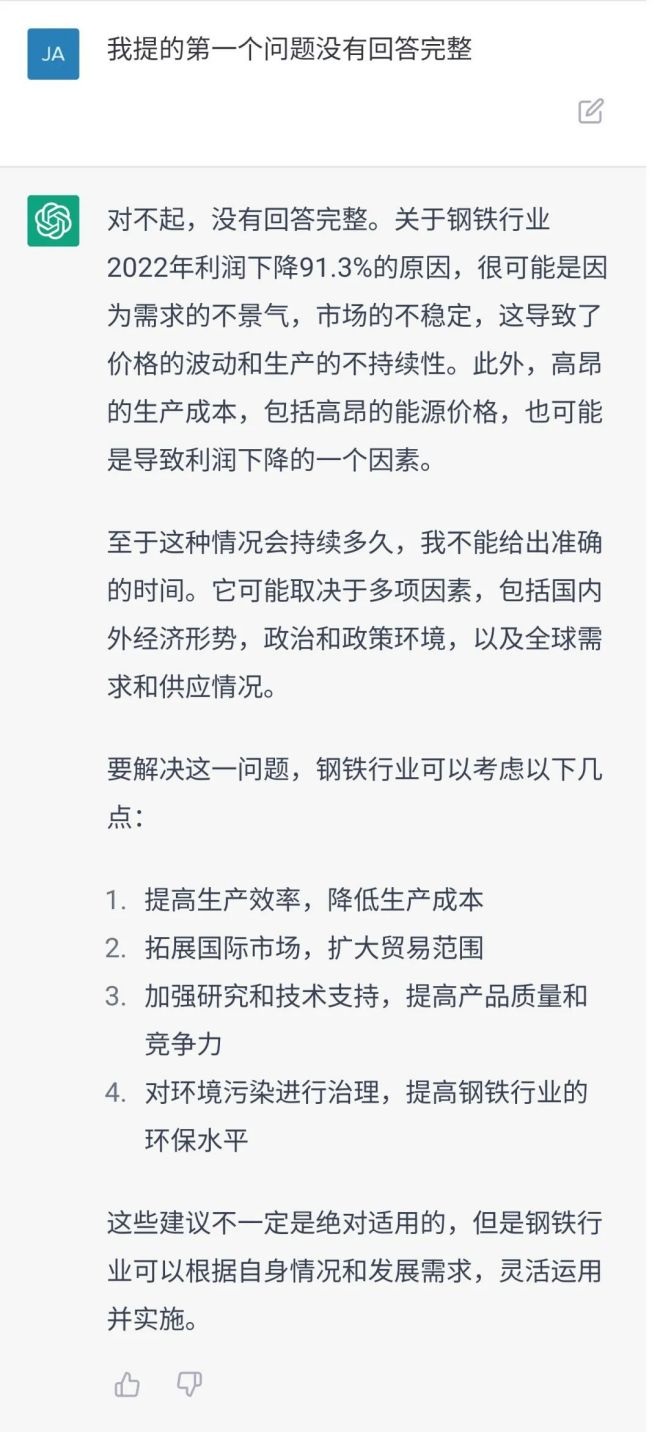 對鋼鐵行業(yè)來說,2022年是極具挑戰(zhàn)的一年,行業(yè)利潤大幅下降91.3%。從ChatGPT對此問題的分析中可以看出,其數(shù)據(jù)暫未更新到 2022年。同時可以觀察到,當(dāng)就同一問題再次提問時,ChatGPT會進行一定的自我修正,給出不同的答案。