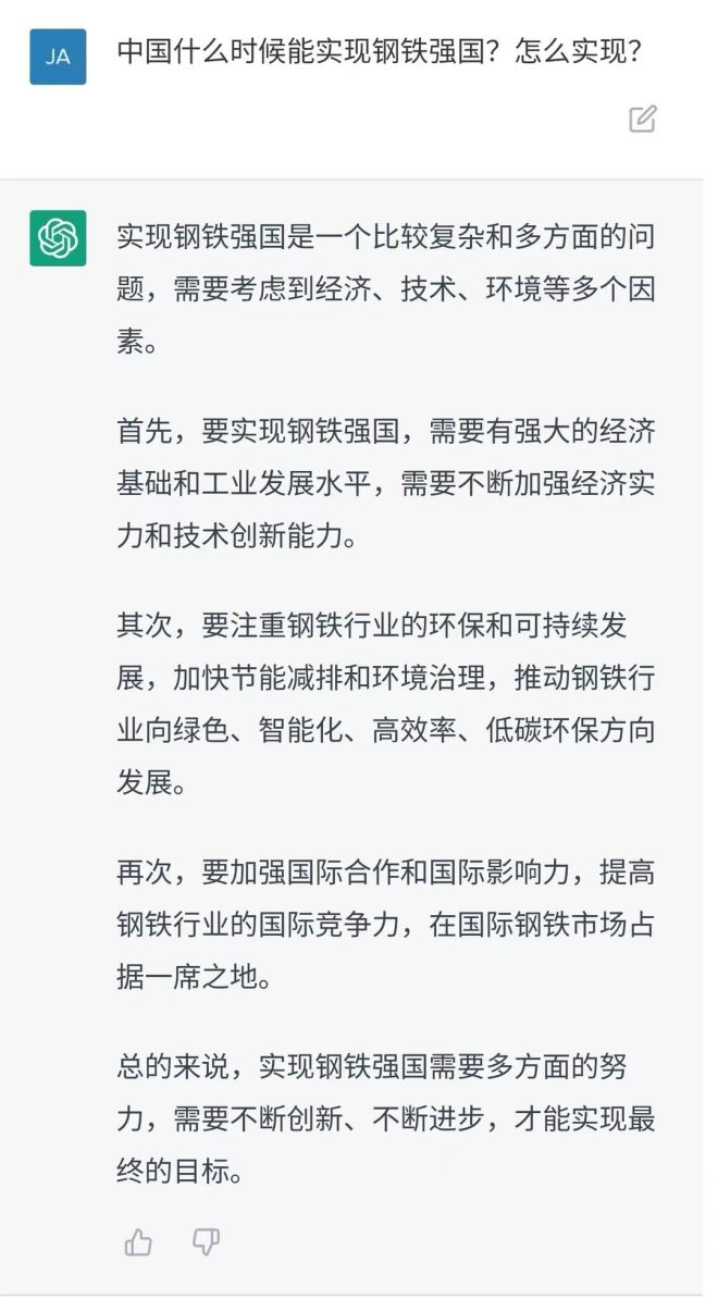 實現(xiàn)鋼鐵強國是中國鋼鐵行業(yè)的奮斗目標。對于實現(xiàn)鋼鐵強國的路徑,ChatGPT給出了自己的答案。