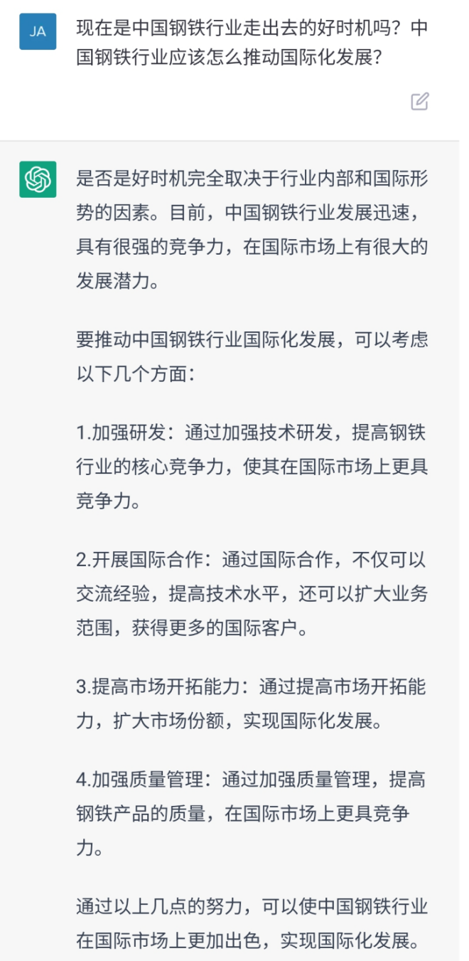 黨的二十大提出,堅持高水平對外開放,加快構(gòu)建以國內(nèi)大循環(huán)為主體、國內(nèi)國際雙循環(huán)相互促進的新發(fā)展格局。同時,2022年12月份,中共中央國務(wù)院印發(fā)的《擴大內(nèi)需戰(zhàn)略規(guī)劃綱要 (2022-2035年)》提出,堅定實施擴大內(nèi)需戰(zhàn)略、培育完整內(nèi)需體系,是加快構(gòu)建新發(fā)展格局的必然選擇。在此種情況下,中國鋼鐵行業(yè)對國際化議題正在進行更深入的思考。對此,ChatGPT的回答是——