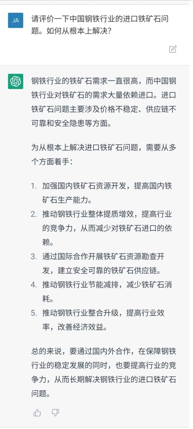 其二,可輔助而非替代。在這些問題中,稍微專業(yè)的是對進口鐵礦石問題的回復(fù)。整體來看,ChatGPT對專業(yè)問題的回復(fù),以大而全、放之四海而皆準的大道理為主,有針對性的深度解析遠遠不夠,只能說是入門級的答案,對于想獲得答案的專業(yè)人士卻有些“意猶未盡”。目前來看,對于各行各業(yè)的專業(yè)人士,談替代可能為時尚早。