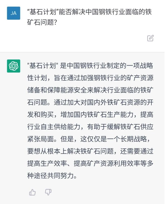 70%~80%的進口鐵礦石依存度,讓中國鋼鐵行業(yè)面臨原材料“卡脖子”風(fēng)險。2021年1月份,中國鋼鐵工業(yè)協(xié)會重磅推出“基石計劃”,“三管齊下”破解鐵礦石資源難題。ChatGPT對這一問題的回答非常“接地氣”,也很符合實際情況。