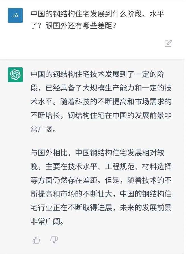 在日本每年新建的20萬棟低層住宅中,鋼結(jié)構(gòu)住宅占市場份額的70%以上。整體來看,國外的鋼結(jié)構(gòu)住宅系統(tǒng)在標準化生產(chǎn)、組裝施工、節(jié)能、防火、抗震等方面已經(jīng)非常成熟。而我國的鋼結(jié)構(gòu)住宅發(fā)展仍在積極推進中。ChatGPT對鋼結(jié)構(gòu)住宅的未來發(fā)展持樂觀態(tài)度。
