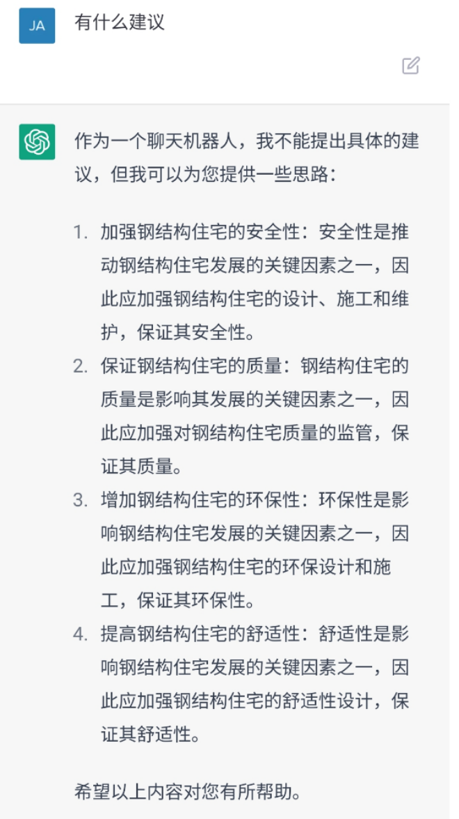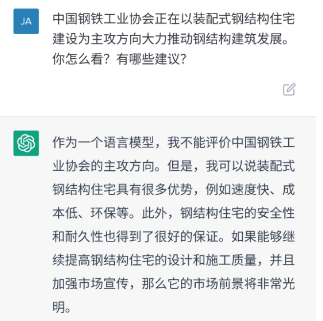 以推廣鋼結(jié)構(gòu)住宅為主攻方向的鋼鐵應(yīng)用拓展計劃是中國鋼鐵工業(yè)協(xié)會明確的兩大產(chǎn)業(yè)發(fā)展計劃之一,是構(gòu)建現(xiàn)代化產(chǎn)業(yè)鏈的題中之義。對于這一重要課題,ChatGPT起初未給出建議,但當(dāng)再次提問時,它提供了一些“思路”。