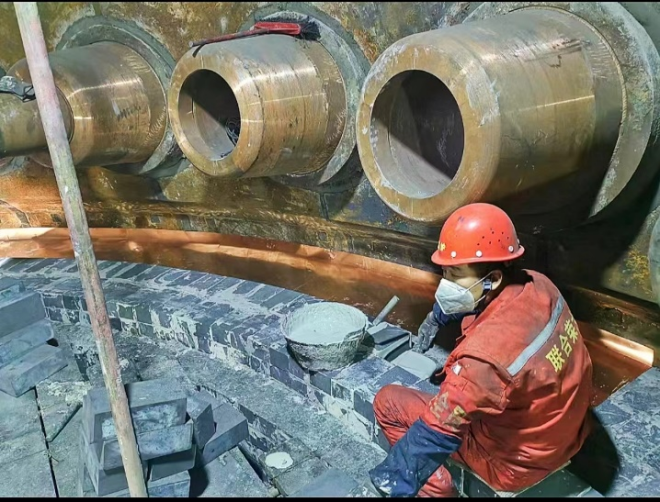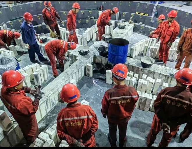 圖為在由聯合榮大總包的陽春新鋼1#高爐快速大修工程中,施工隊正在砌筑爐底陶瓷杯。