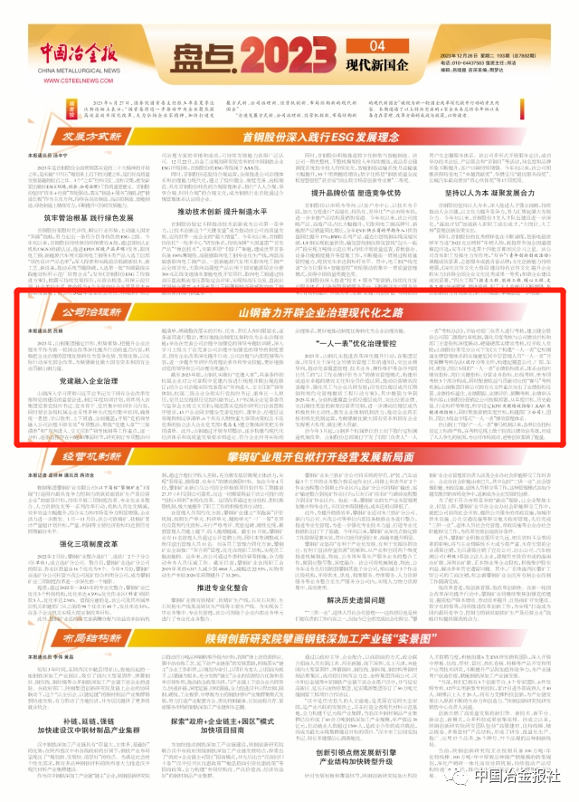 2023年,山鋼集團(tuán)錨定目標(biāo)、積勢(shì)蓄勢(shì),把提升企業(yè)治理水平作為新一輪國(guó)企改革深化提升行動(dòng)的重點(diǎn)內(nèi)容,積極把企業(yè)治理的管理優(yōu)勢(shì)轉(zhuǎn)化為競(jìng)爭(zhēng)優(yōu)勢(shì)、發(fā)展優(yōu)勢(shì),以實(shí)際行動(dòng)深化國(guó)企改革,為做強(qiáng)做優(yōu)做大國(guó)有資本和國(guó)有企業(yè)貢獻(xiàn)山鋼力量。