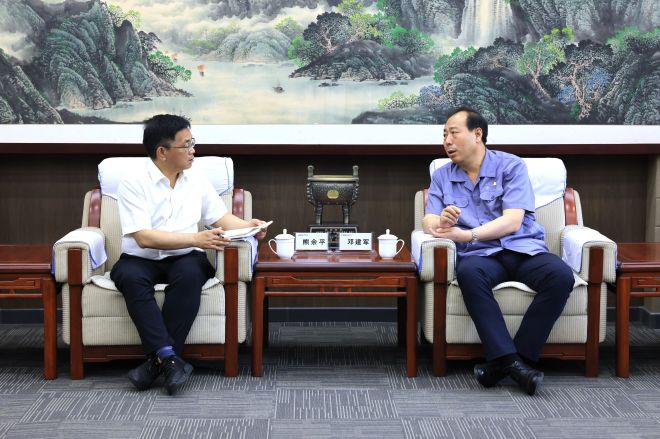 圖為鄧建軍(右)和熊余平(左)座談交流現場
