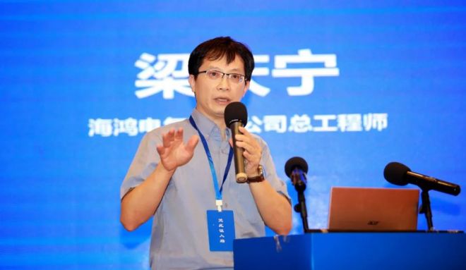 圖為梁慶寧做《立體卷鐵心技術創新與發展》的報告