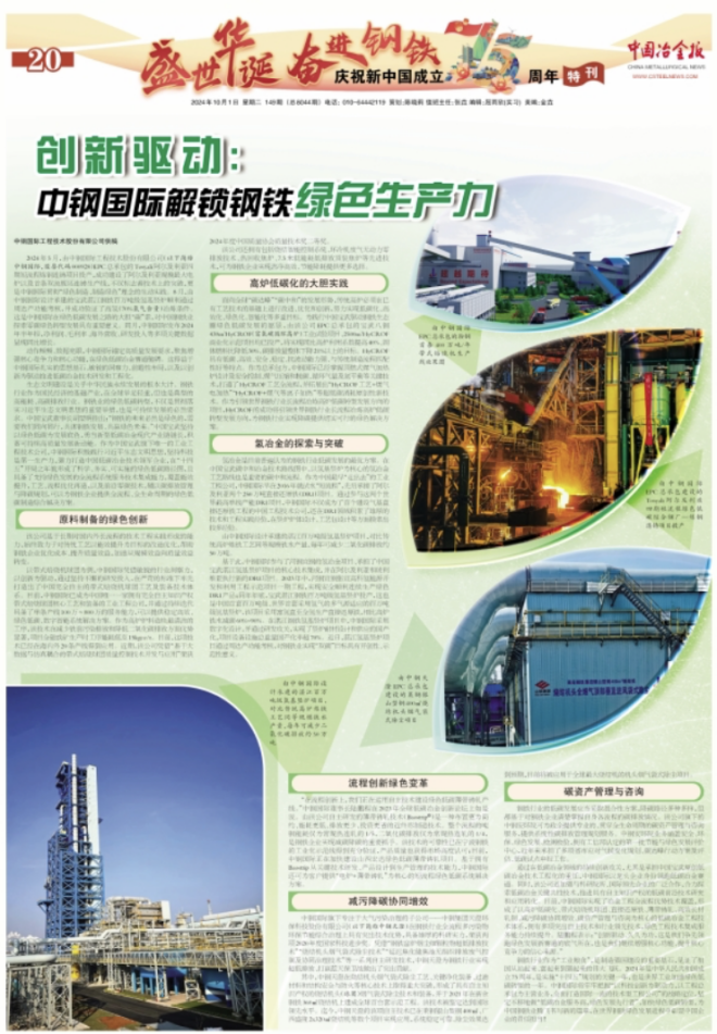 鋼鐵行業作為“工業糧食”,是制造強國建設的重要基石,見證了祖國從站起來、富起來到強起來的偉大飛躍。2024年是中華人民共和國成立75周年,是實施“十四五”規劃的關鍵一年,也是世界工業加速綠色低碳轉型的一年。中鋼國際將牢牢把握“以科技創新為驅動力,以工程總承包為主營業務,全面打造國際一流的技術型工程公司”的戰略定位,堅定不移地做“低碳冶金服務商,綠色發展先行者”,加快綠色低碳轉型,為中國鋼鐵業騰飛書寫新的篇章,在世界鋼鐵綠色發展進程中彰顯中國企業的責任擔當!