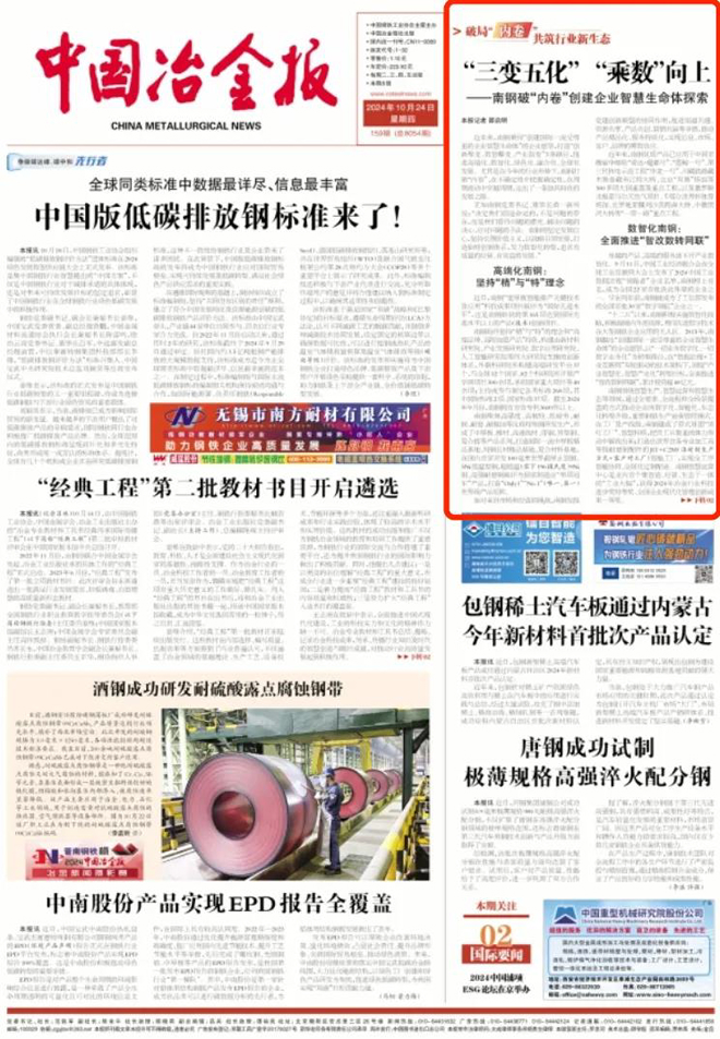 卓越的產品、高端的服務離不開產業數智化。9月11日,中國工業經濟聯合會在全球工業互聯網大會上發布了2024中國工業數據治理“領跑者”企業名單,南鋼榜上有名,成為全國22家首批獲此殊榮的企業之一。早在兩年前,南鋼就成為了工信部發布的全國首批30家“數字領航”企業之一。