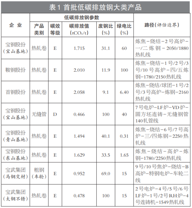 2024年10月23日,中國鋼鐵工業協會在2024年全球低碳冶金創新論壇上發布首批中國低碳排放鋼大類產品。此次發布的低碳排放鋼產品(表1)在發布EPD報告的基礎上,基于第三方認證機構數據審核,按照鋼協《低碳排放鋼評價方法》團體標準規定的原則、方法和程序進行了嚴格規范的評價。