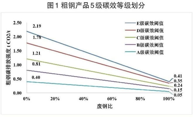第三,等組分類體系,以廢鋼加入比例滑動計算,廢鋼加入比例越高,相應等級分類閾值也越低(圖1),以鼓勵鋼廠采取添加廢鋼之外的減碳技術。