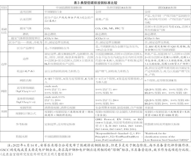 本文選取國外兩個有代表性的標準與鋼協標準進行比較(表3),分別是負責任鋼鐵組織的RS標準與德國鋼協的LESS標準,其中,RS標準是指《Responsible steel International Production Standard》2.1版,這是在2022年9月14日發布的《Responsible steel International Standard》2.0版基礎上,經1年左右試驗運行與公開征求意見后修訂完善并更名的最新版本。LESS標準是指2024年4月底德國鋼鐵工業協會(WV Stahl)和聯邦經濟事務和氣候保護部(BMWK)聯合發布的低碳鋼鐵標準。