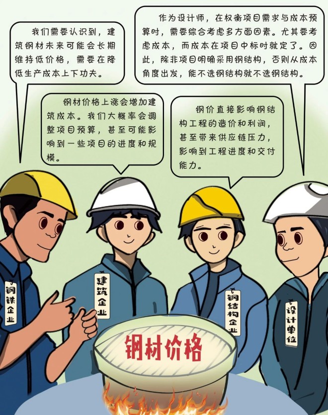近日,在北京舉行的中央經濟工作會議明確,明年要培育綠色建筑等新增長點。作為綠色建筑代表之一的裝配式鋼結構建筑,產業鏈涉及多個行業,且各行業對鋼結構建筑的認識各有特色。對此,中國冶金報特推出《圍爐煮“鋼構”》欄目,主要以漫畫形式展示鋼結構建筑產業鏈上各方對熱點話題的觀點,敬請期待。