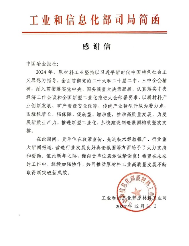 2024年12月31日,工業(yè)和信息化部原材料工業(yè)司向中國(guó)冶金報(bào)社發(fā)來(lái)感謝信,感謝報(bào)社在政策宣傳、先進(jìn)技術(shù)經(jīng)驗(yàn)推廣、行業(yè)重大新聞報(bào)道、營(yíng)造行業(yè)發(fā)展良好輿論氛圍等方面給予的大力支持和幫助,并希望雙方在未來(lái)的工作中,繼續(xù)加強(qiáng)協(xié)作,共同推動(dòng)原材料工業(yè)高質(zhì)量發(fā)展不斷取得新突破、新成效。