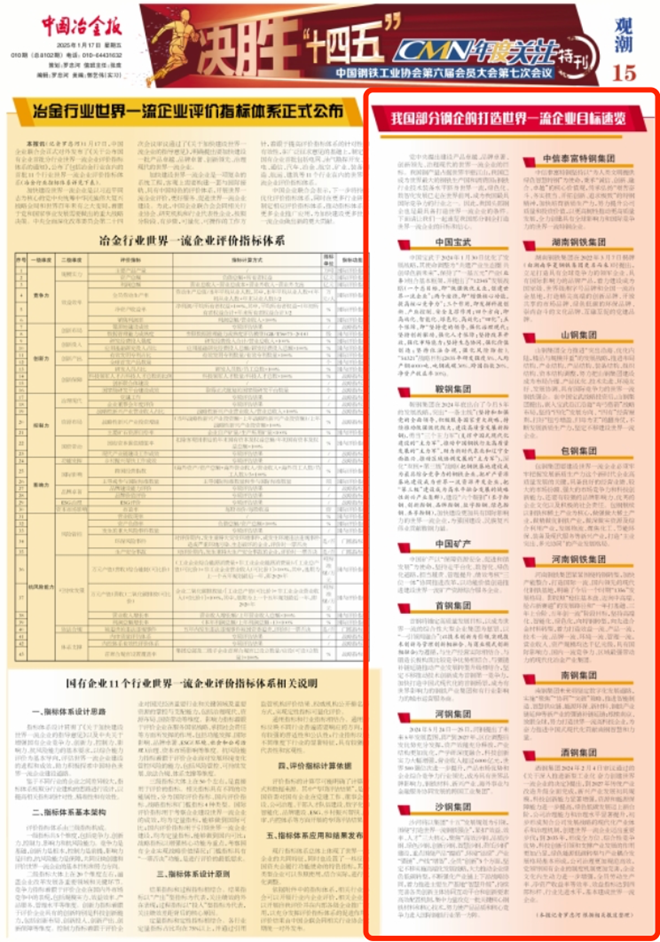 黨中央提出建設產品卓越、品牌卓著、創新領先、治理現代的世界一流企業的目標。我國鋼產量占據世界半壁江山,我國已成為世界最大的鋼鐵生產國和消費國;鋼鐵行業技術裝備水平躋身世界一流,綠色化、數智化發展已走在世界前列,成為我國最具國際競爭力的行業之一。因此,我國頭部鋼企也是最具備打造世界一流企業的條件。下面請讓我們一起速覽我國部分鋼企打造世界一流企業的目標和信心。
