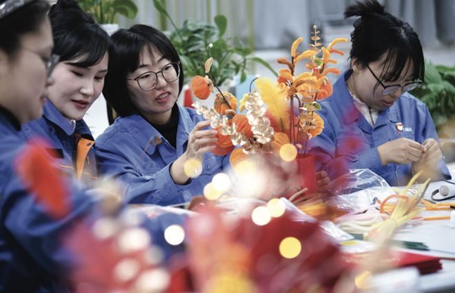 1月13日,中國寶武太鋼集團女職工在手工制作年宵花(如圖)。當天,太鋼工會組織開展了“巧手迎新春匠心蘊風采”活動。女職工們會聚一堂,展現“巧”功夫,以自制作品喜迎乙巳蛇年春節的到來。(本報記者 王旭宏 攝)
