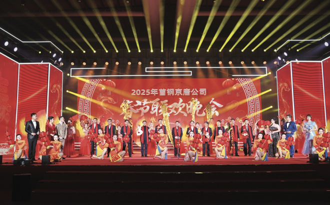 祥龍辭歲福滿鋼城,金蛇起舞夢想啟程。1 月23日晚,首鋼京唐公司在廠前體育館內,舉辦2025年春節聯歡晚會。首鋼京唐、各協力單位的職工家屬歡聚一堂,載歌載舞,共迎新春。圖為首鋼京唐領導上臺致新春賀詞。(楊立文 攝)