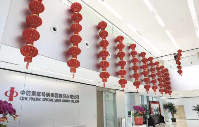 1月23日,中信泰富特鋼集團科技大樓,工作人員(右上)正在大廳懸掛喜慶的大紅燈籠,迎接蛇年春節。(特約通訊員 陸衛宇 攝)