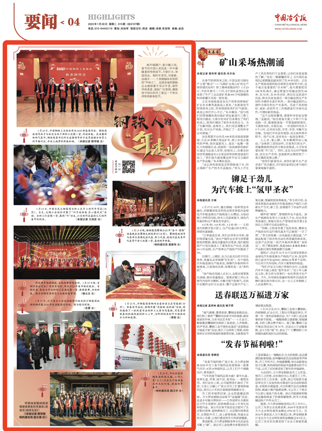 蛇年福滿戶,春日暖人間。春節對中國人來說是一年中最隆重的傳統佳節,萬家燈火、舉國同慶。制作年宵花、寫春聯、送福字……十里鋼城似有別樣的“年味兒”。全國各地的鋼鐵企業提前著手采辦年貨,制作風味美食,裝扮廠區家園,確保堅守崗位的員工度過一個歡樂祥和的新春佳節。