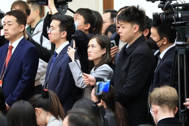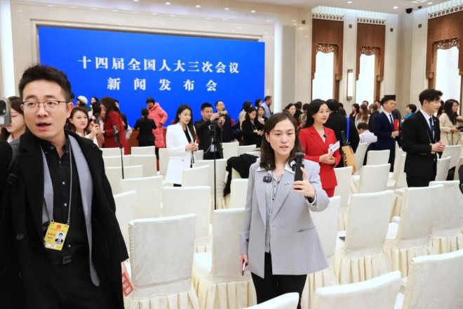 中國(guó)冶金報(bào)社兩會(huì)報(bào)道組記者樊三彩(中)在新聞發(fā)布會(huì)上拍攝小視頻報(bào)道