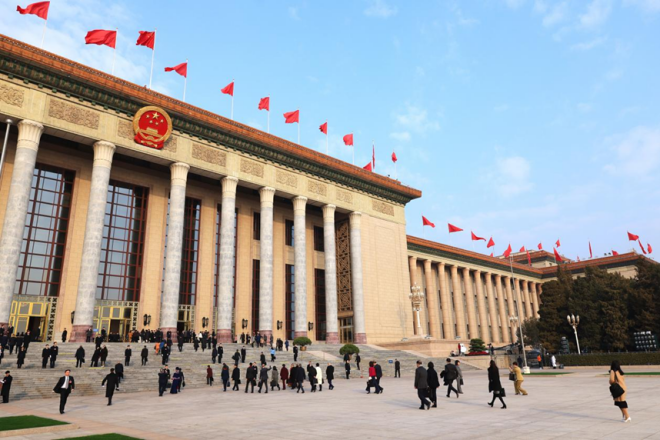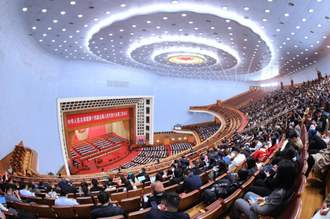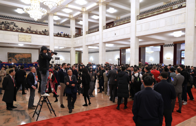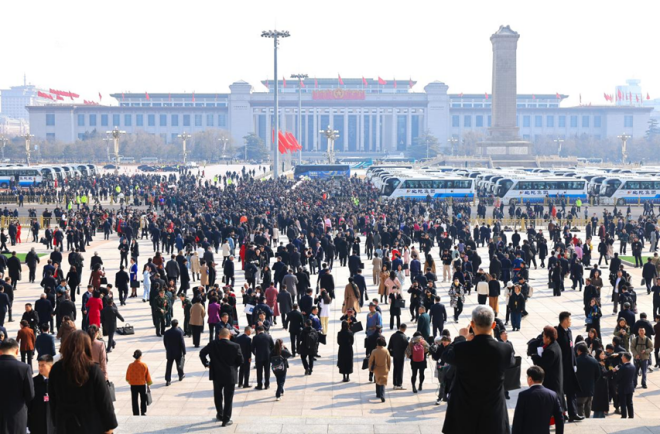 人民大會堂穹頂的五星輝光與會場內外躍動的民意共振,激蕩著新時代中國勇毅前行的鏗鏘足音——