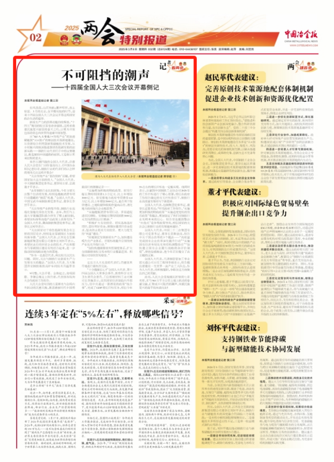從“AI(人工智能)+傳統產業”的加速賦能到“從0到1”的原創技術策源地建設,從資源綜合利用到新型儲能技術發展,從鄉村振興的縱深推進到綠色低碳發展的創新實踐……鋼鐵行業代表們手中的議案建議,既是解碼中國道路的密鑰,又是昭示未來征程的星火。