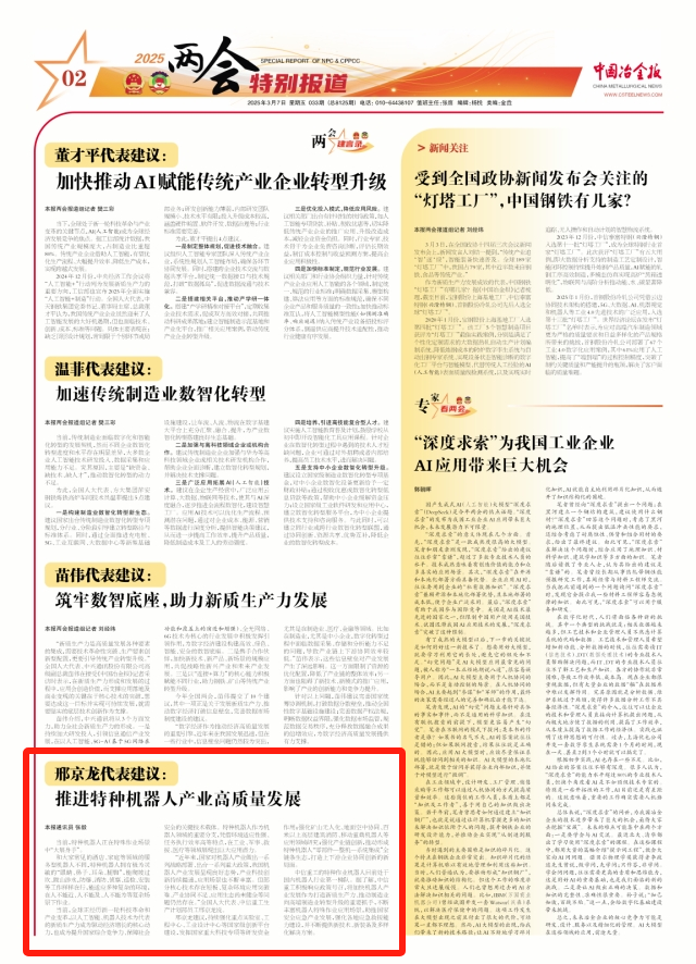 “近年來,國家對機器人產業做出一系列戰略部署、出臺一系列重大政策,我國機器人產業發展呈現良好態勢,產業科技創新持續提速,應用場景也不斷豐富。但部分核心技術存在短板、復雜環境應用突破難、產業協同不足、應用生態尚未健全等問題仍然存在。”全國人大代表、中信重工生產計劃部員工邢京龍說。