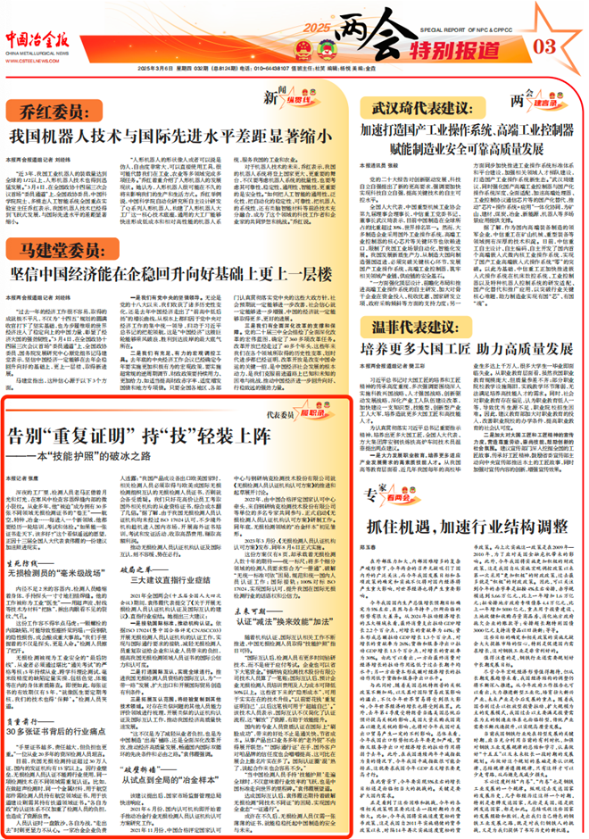 深夜的工廠里,檢測人員老馬正借著月光和燈光,在寒風中檢查容器焊縫內部的微小裂紋。從業多年,他“被迫”成為擁有30多張不同領域無損檢測證書的“卷王”——航空、特種、冶金……每進入一個新領域,他都要經歷一輪培訓、考試和體檢。“如果能一張證書走天下,該多好?”這個看似遙遠的愿望,正因十三屆全國人大代表袁偉霞的一份建議加速照進現實。