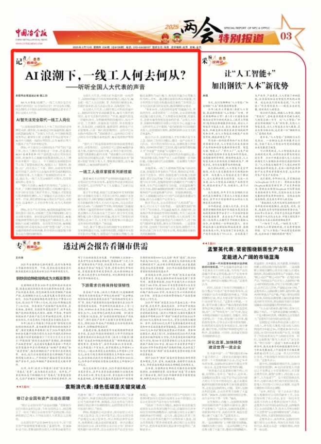 AI(人工智能)浪潮下,一線工人崗位是否有被取代的風險?應當如何應對?針對這些問題,兩會期間,中國冶金報社兩會報道組記者采訪了多位全國人大代表。