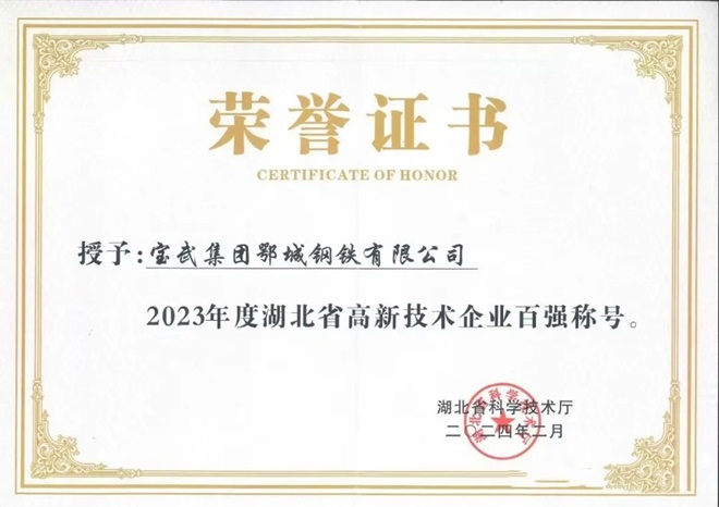 圖為2023年湖北高企百強證書。