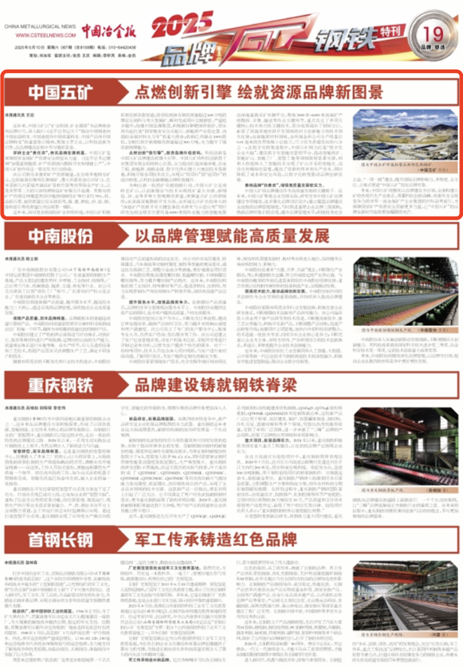 近年來,中國五礦以“礦業報國、礦業強國”為品牌使命和品牌口號,深入踐行習近平總書記關于“推動中國制造向中國創造轉變、中國速度向中國質量轉變、中國產品向中國品牌轉變”的重要指示精神,聚焦主責主業,以科技創新為引擎,在品牌建設征程中書寫精彩答卷。