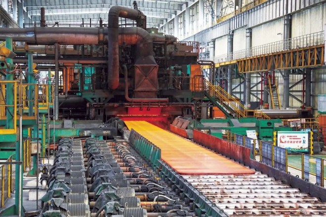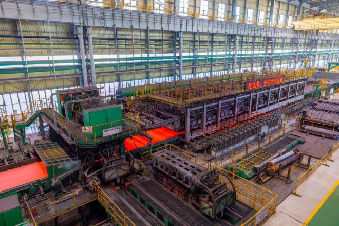 圖為日照公司中厚板廠爐卷產(chǎn)線極限薄寬規(guī)格鋼板高效穩(wěn)定生產(chǎn)現(xiàn)場。(日照公司 供圖)