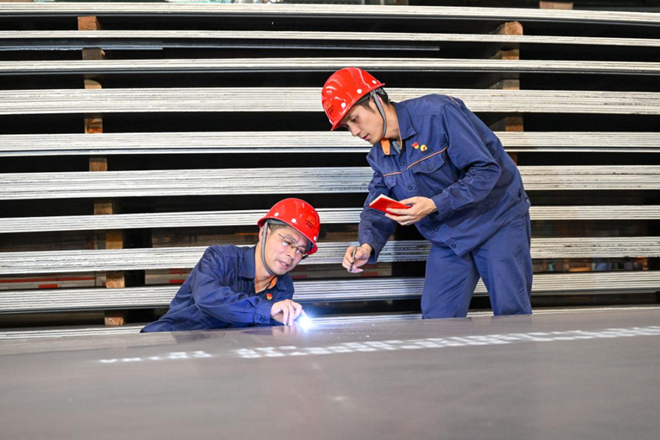 湘鋼技術人員正在對鋼板進行表面質量檢查。(賀意波 拍攝)
