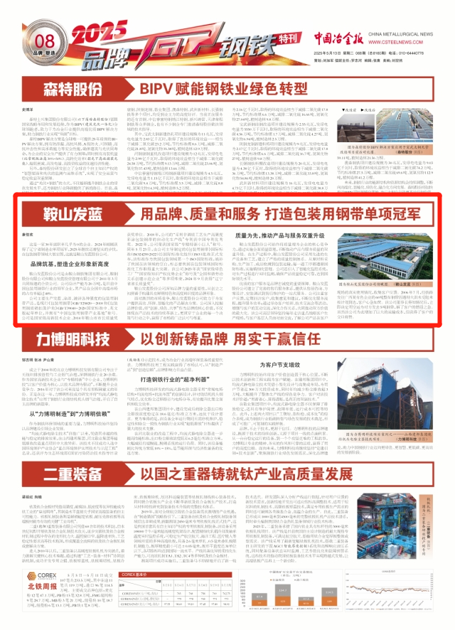 公司主要生產(chǎn)發(fā)藍(lán)、涂漆、鍍鋅各種強(qiáng)度的包裝用鋼帶產(chǎn)品,是現(xiàn)行《包裝用鋼帶》GB/T25820—2018和《包裝用鋼質(zhì)鎖扣及護(hù)角》GB/T39040-2020國(guó)家標(biāo)準(zhǔn)中、英文版起草單位,并擁有“中國(guó)包裝用鋼帶產(chǎn)業(yè)基地”稱號(hào)。公司是國(guó)家級(jí)高新技術(shù)企業(yè)、2014年鞍山市市長(zhǎng)質(zhì)量獎(jiǎng)獲獎(jiǎng)單位。2018年,公司的“采用非調(diào)質(zhì)工藝生產(chǎn)高強(qiáng)度彩涂包裝鋼帶的自動(dòng)化生產(chǎn)線”專利獲中國(guó)專利優(yōu)秀獎(jiǎng)。2022年,公司榮獲國(guó)家級(jí)“專精特新小巨人”稱號(hào)。同年5月23日,由公司主導(dǎo)制定的《包裝用鋼帶》國(guó)際標(biāo)準(zhǔn)(ISO24259:2022)經(jīng)國(guó)際標(biāo)準(zhǔn)化組織(ISO)批準(zhǔn)正式發(fā)布,該標(biāo)準(zhǔn)作為我國(guó)包裝領(lǐng)域第一個(gè)ISO國(guó)際標(biāo)準(zhǔn),填補(bǔ)了我國(guó)在該領(lǐng)域的空白,標(biāo)志著我國(guó)在包裝領(lǐng)域國(guó)際標(biāo)準(zhǔn)化工作取得重大突破。該公司2023年獲“國(guó)家級(jí)綠色工廠”“國(guó)家級(jí)知識(shí)產(chǎn)權(quán)優(yōu)勢(shì)企業(yè)”稱號(hào)及“全國(guó)和諧勞動(dòng)關(guān)系創(chuàng)建示范企業(yè)”等多項(xiàng)殊榮,2024年9月獲得“遼寧省省長(zhǎng)質(zhì)量獎(jiǎng)”。