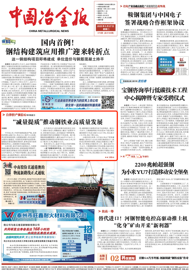 在此形勢下,鋼鐵企業(yè)應(yīng)實施精準產(chǎn)能調(diào)控,建立動態(tài)供需匹配機制,通過智能化生產(chǎn)管理系統(tǒng)實現(xiàn)柔性化生產(chǎn)。在“雙碳”目標引領(lǐng)下,重點布局氫能煉鋼、短流程冶煉等綠色技術(shù)突破,加速高端特種鋼材的研發(fā)應(yīng)用。建議構(gòu)建“三化協(xié)同”發(fā)展模式,即以工藝革新推動綠色化轉(zhuǎn)型、以產(chǎn)品升級帶動高端化發(fā)展、以數(shù)字賦能實現(xiàn)智能化運營,通過實施“產(chǎn)能做減法、價值做加法”的“減量提質(zhì)”戰(zhàn)略發(fā)展路徑,方能在復(fù)雜經(jīng)濟形勢下培育差異化競爭優(yōu)勢,獲得可持續(xù)發(fā)展空間。(王國清(作者系蘭格鋼鐵研究中心主任))