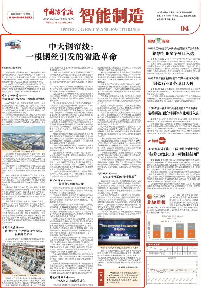 “我們構建了覆蓋全廠的‘工業互聯網神經系統’。”中天鋼鐵集團總裁助理,淮安公司總經理、黨委書記陳軍召介紹,中天淮安公司通過5G專網與工業光纖環網的深度融合,實現了設備、物料、產品的全面互聯,通過自動化、信息化,爭取把人效、機器效率、能效提升到最佳水平。