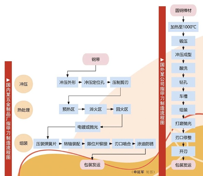中外兩家企業生產的指甲刀結構類型不同,生產工藝也有著明顯區別。國內企業用沖壓方式生產,材料為鋼板;而國外企業用鍛造方式生產,材料為圓鋼。兩家企業生產線視頻的宣傳重點也不同,國內企業主打生產線自動化,國外企業則注重宣傳手工打磨、精打細磨。這反映了兩家企業對指甲刀的市場定位不同。