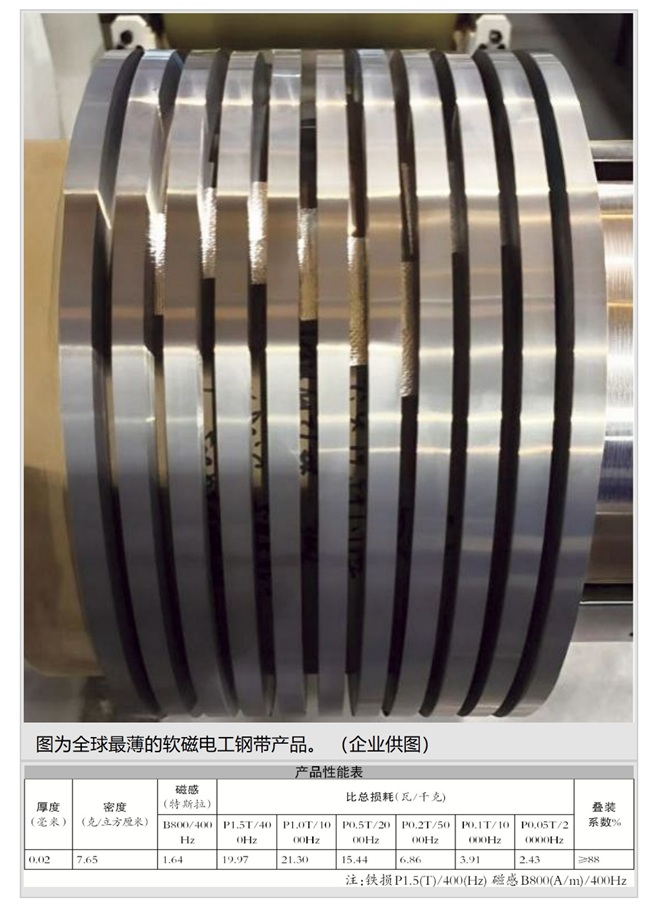 “如今,我們0.02毫米全球最薄電工鋼帶的成功下線,一舉擊穿國外30年技術壁壘,讓中國高端裝備首次擁有‘毫米級體積、微米級精度、毫秒級響應’的國產心臟,更把‘中國厚度’推向全球鐵芯材料供應鏈的最頂端——0.02毫米,重新定義了世界超薄電工鋼的‘天花板’。目前,我們正在進行0.018毫米的開發(fā)。”日前,該公司董事長黃穗對《中國冶金報》記者說。