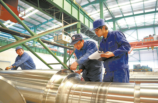 本鋼恒通質監人員正在測量剛剛下線的磨輥尺寸精度。  (田崢 攝)