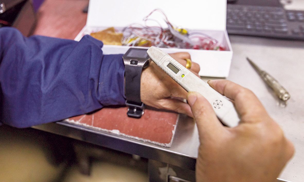 傅署陽發(fā)明的這款電筆智能在哪里?傅署陽給筆者展示了這款“智能有電危險(xiǎn)提醒手表”的創(chuàng)新技術(shù)特點(diǎn)。他一邊佩戴一邊向筆者介紹說:“這款電筆就像智能手表,戴在手腕上,在感應(yīng)到有電裝置時(shí),可以通過報(bào)警聲音、警示燈光、發(fā)出振動等多種形式提醒作業(yè)人員,觸感十分靈敏。若是非專業(yè)電工人員進(jìn)入有電區(qū)域,無需直接接觸帶電體,通過振動警示即可知曉。”