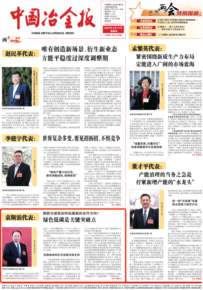 2024年,我國建筑用鋼占比首次低于制造業用鋼,鋼鐵與建筑應拓展哪些新的合作方向?“鋼鐵和建筑在綠色低碳方面應多多合作,這是下一步的關鍵突破點。”3月6日,全國人大代表,中國五礦所屬中國二十二冶集團黨委書記、董事長袁斯浪在接受《中國冶金報》記者專訪時提出。