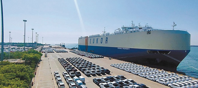 日前,2984輛國產商品車和95件設備搭乘“黎明昌盛”輪由天津國際郵輪母港碼頭駛往南美洲,創下今年初以來天津港外貿商品車單船出口作業量新高。圖為等待裝船的天津國際郵輪母港碼頭一角。 (記者 蔡立軍 供圖)