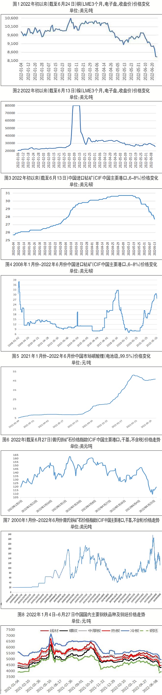2022年上半年,眾多突發事件致全球經濟預期減弱,資本的避險需求推動全球金屬礦業延續“牛市”行情。而新冠肺炎疫情的反復嚴重干擾了中國年度經濟發展目標的實現。從2022年“牛尾”行情的運行情況看,各金屬品種表現不一,但有色金屬明顯強于黑色金屬。具體而言,鋼材市場消費不暢,市場疲軟,偏弱運行,而最令行業頭疼的鐵礦石價格“名弱實強”問題致鋼材行業利潤大幅下降,以銅為代表的基本金屬雖堅挺但疲態盡顯,資本青睞的新能源金屬依舊搶眼但隱患重重。縱觀2022年后半場的金屬礦業形勢:大國競爭,資源為王;穩價保供,策略先行。