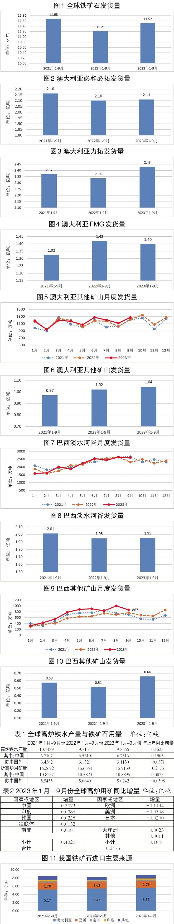 全球發貨量有所波動,發貨來源結構變化較小。據世界鋼鐵協會數據,2023年1月—9月份,全球鐵礦石累計發貨量為11.52億噸,較2022年同期增加3043萬噸,但較2021年同期減少1637萬噸(如圖1所示)。
