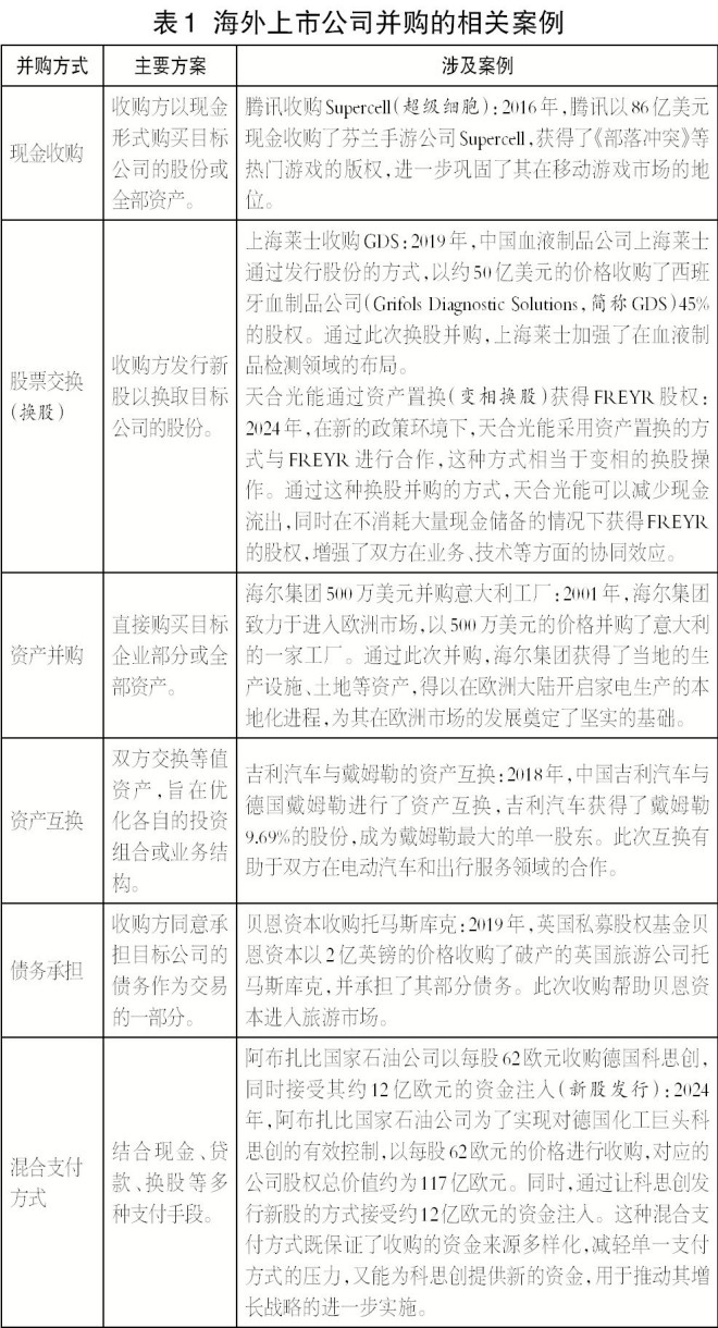 海外上市公司并購的常見方式包括現金收購、股票交換(換股)、債務承擔、資產收購、資產互換等(海外上市公司并購的相關案例見表1)?,F金收購,即以現金購買目標公司股份,迅速獲得控制權,但需大量現金流。股票交換(換股),即通過發行新股換取目標公司股份,避免大額現金支出,但可能稀釋現有股東股權。債務承擔,指收購方承擔目標公司債務,適用于負債較高但資產優質的目標公司,但會增加收購方的財務風險。資產互換是雙方交換等值資產,優化投資組合,減少現金流出。混合支付方式則綜合了以上多種方式的特點,根據具體的并購需求和市場情況靈活搭配現金、股票、債務承擔、資產互換等手段,從而實現海外上市公司并購的目標。這種方式在大型復雜的跨國并購中更為常見,它可以最大限度地平衡各方利益,并提高并購成功的可能性。