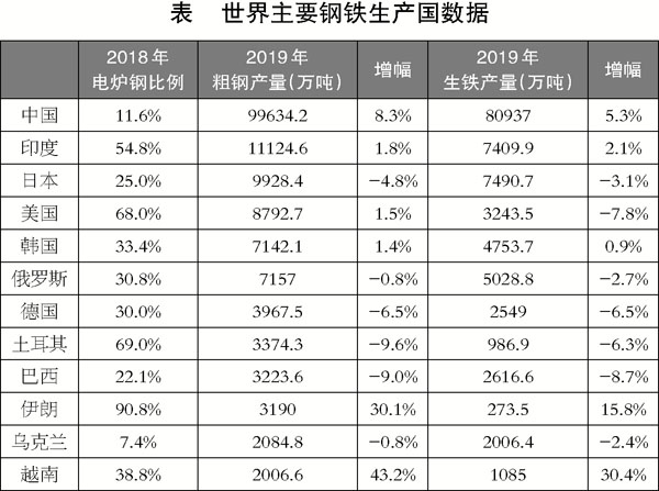 從生鐵產量來看,2019年,除中國、印度和韓國之外,其他所有國家的生鐵產量都是下降的。其中,巴西同比下降8.7%,德國同比下降6.5%,土耳其同比下降6.3%,日本同比下降3.1%,俄羅斯同比下降2.7%。盡管美國2019年的粗鋼產量增長了1.5%,但其生鐵產量同比下降了7.8%,這是由于其電爐鋼比例高(2018年為68%)。伊朗也是類似情況,其粗鋼產量在2019年增長了30%,達到3190萬噸,但由于電爐鋼比例高達90%,2019年其生鐵產量僅為273.5萬噸(同比增長15.8%)。