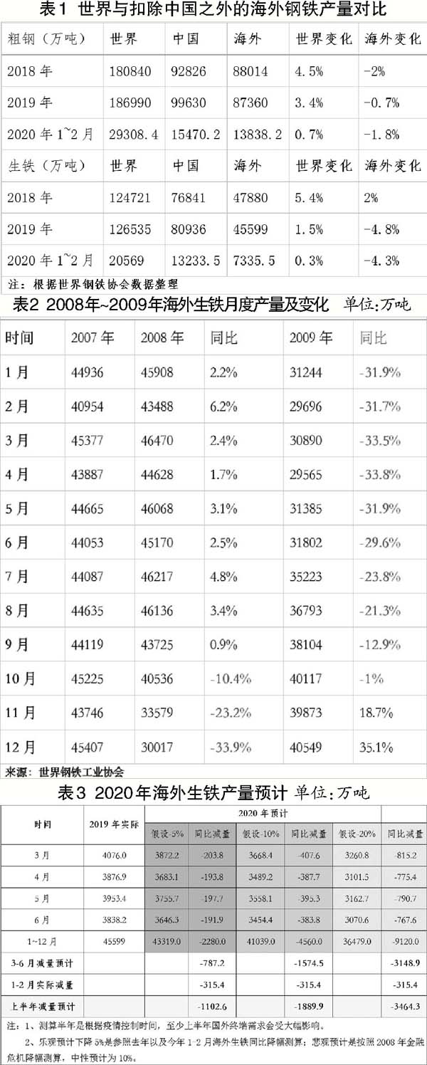 從近期的情況看,影響海外鋼鐵減產的因素有3個。一是在疫情之前,全球經濟增長本已乏力,海外鋼企自去年第四季度開始陸續減產,并延續到了今年前2個月,在需求沒轉好的情況下,預計減產還會延續。二是當前為防止疫情擴散和保障人員安全而進行的停產、減產。海外疫情普遍在3月份開始并逐漸加劇,預計停產、減產在隨后得到體現。三是疫情對消費的影響將逐漸傳導至上游行業,這個是最致命的,將使海外鋼廠加速減產,且預計減產會持續較長時間。本文擬通過對2019年和2020年前2個月海外的粗鋼和生鐵生產情況、2008年~2009年上一輪金融危機時海外鋼鐵產量的變化情況進行回顧分析,對今年3月~6月份和全年的海外鋼鐵產量及鐵礦石需求減少量進行測算。